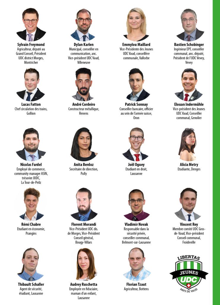 Les Jeunes UDC vaudois présentent 19 candidats au Conseil national à l’occasion des élections fédérales du 20 octobre prochain.